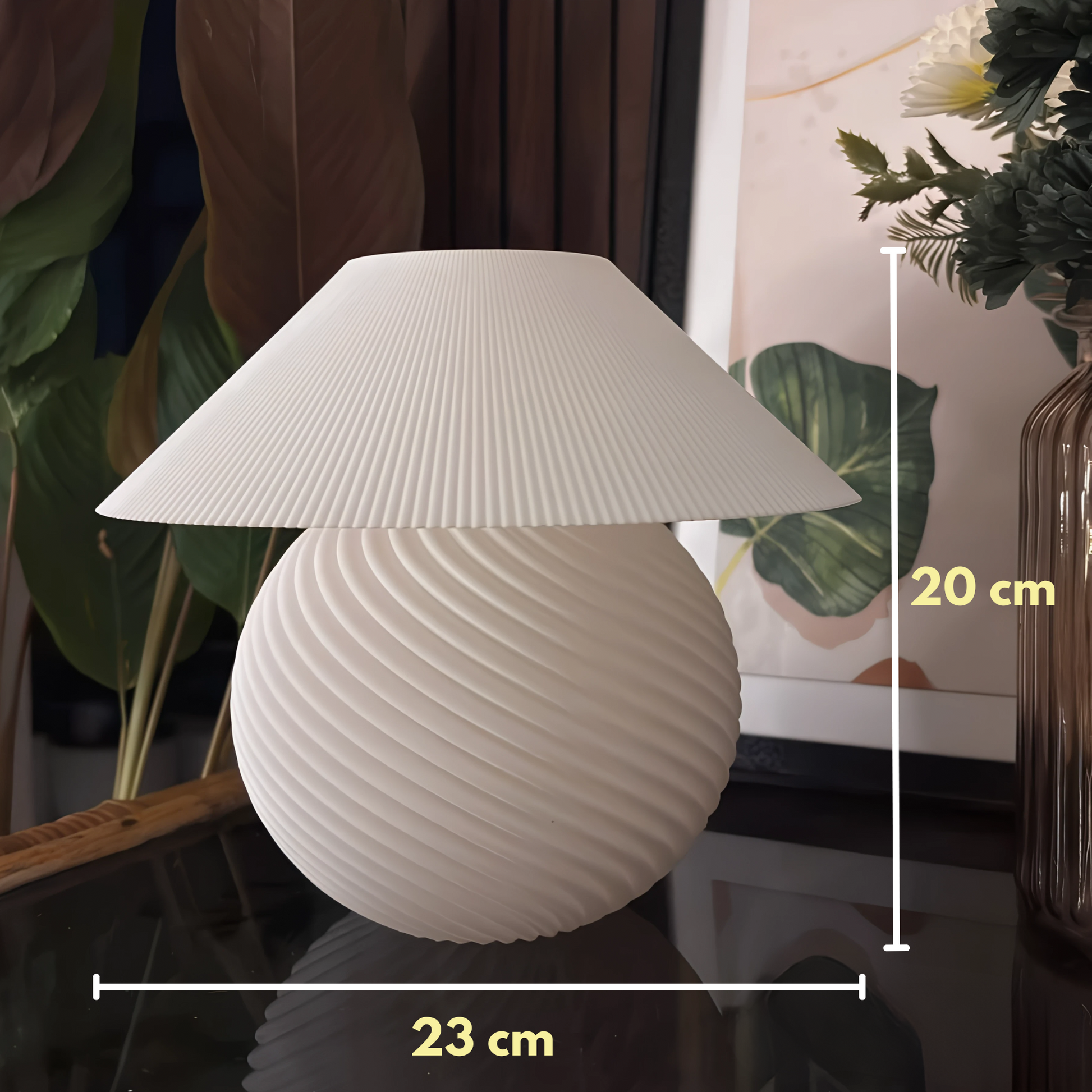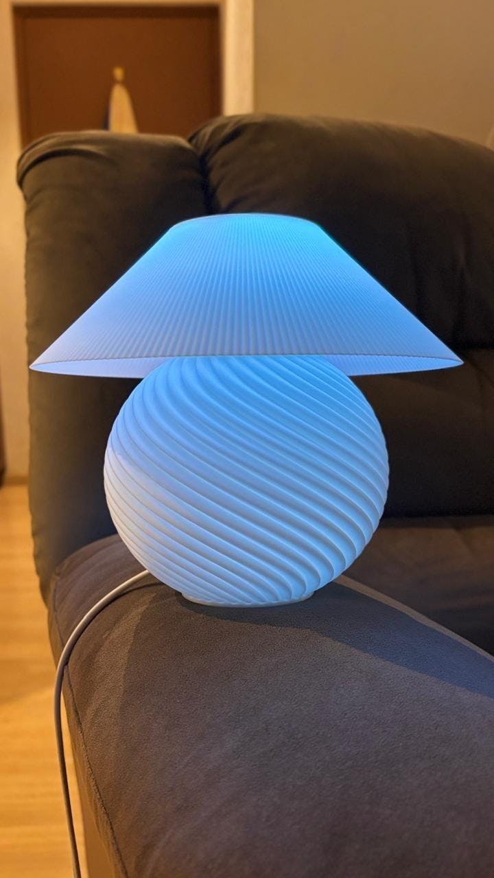 Its soft dome rests gracefully over a ribbed 3D-printed sphere, casting delicate patterns when lit. The light-diffusing, bio-based material glows warmly—inviting calm into your space, whether it's evening wind-down time or a quiet moment of pause.